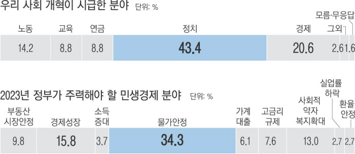 경향신문 신년 여론조사에서 한국 사회에서 개혁이 가장 시급한 분야로는 ‘정치’가 꼽혔다. 새해 윤석열 정부가 가장 주력해야 할 민생경제 분야는 물가 안정이 1순위로 꼽혔다. 극심한 인플레이션 때문인 것으로 분석된다.