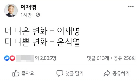 이 후보는 이날 낮 12시쯤 자신의 페이스북에 “더 나은 변화=이재명, 더 나쁜 변화=윤석열”이라고 글을 올렸다. 그간 이 후보가 페이스북에 자주 써 왔던 긴 글과는 차이가 있었다. 등호(=)를 빼면 단 16글자만 남긴 것이다.