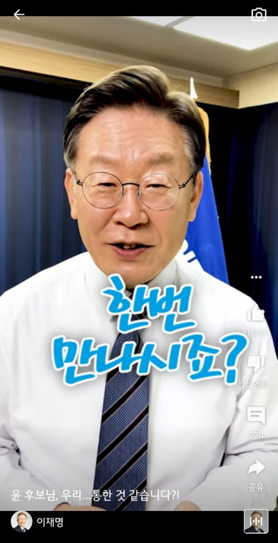 이 후보는 이어 오후 2시쯤 유튜브에 29초짜리 ‘쇼츠’ 영상을 올렸다. ‘윤 후보님, 우리…통한 것 같습니다?!’라는 제목의 영상에는 이 후보가 ‘병사월급 200만원, 전기차 보조금 대상 확대, 성폭력 가해자 처벌 강화’ 구상을 밝혔고, 윤 후보가 이 후보보다 늦게 비슷한 공약을 내놨다는 내용이 담겼다. 영상에 등장하는 이 후보는 “토론도 할 겸 만나시죠”라고 하며 휴대전화를 꺼내 일정을 확인하는 모습이 담겼다. 이 후보가 ‘비었다’고 하는 날은 이날부터 20대 대선 전날인 3월8일까지의 모든 날이었다.