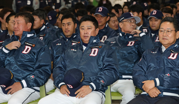 김태형 두산베어스 감독이 15일 오전 서울 잠실야구장에서 열린 두산 베어스 시무식·창단기념식에 참석해 자리하고 있다. 연합뉴스