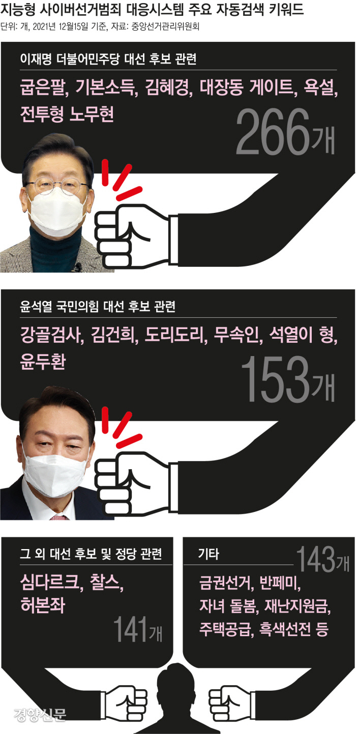 키워드는 지난달 15일 기준 703개다. 키워드에는 이재명 더불어민주당·윤석열 국민의힘 대선 후보를 포함해 주요 후보들과 연관된 거의 모든 단어들이 포함돼 있다. 이재명 후보의 경우 ‘대장동 게이트’나 ‘욕설’ 등 의혹 관련 단어들과 이 후보 상징인 ‘기본소득’과 ‘굽은팔’이 포함돼 있다. 윤 후보의 경우 ‘도리도리’ ‘무속인’ 등 논란이 될 만한 단어와 ‘강골검사’ ‘석열이 형’ 등 긍정적인 이미지의 단어가 모두 학습 대상이다. 심상정 정의당·안철수 국민의당 대선 후보의 경우도 비슷하다. ‘흑색선전’ ‘반페미’ ‘주택공급’ 등 특정 후보와 관계는 적으나 대선 이슈가 된 단어들도 AI는 모두 검색한다. 선관위 관계자는 “키워드들은 보통 매월 중순 업데이트되며, 신뢰성을 담보하기 위해 선관위 홈페이지에 공개한다”고 말했다.