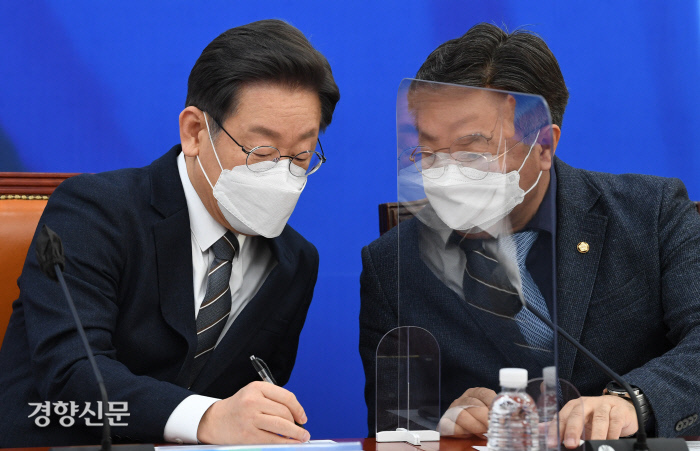 민주당은 코로나19 신속 검사를 포함해 일상생활과 방역이 공존하는 대응 패러다임 전환에 방점을 찍었다. 확진자수를 줄이기 위해 기존처럼 방역 고삐를 당길 때 국민들이 느낄 피로도와 불만이 커질 수 있기 때문이다. 정부도 방역 패러다임 전환을 검토하고 있으나, 이 후보는 여기에 ‘이재명표’를 붙여 자신의 공적으로 치환하려는 모습도 보였다. 이 후보는 이날 회의 도중 경기 여주시에서 시행 중인 신속 PCR 검사 사례가 소개되자 “제가 하자고 했는데 정부가 못한 것”이라고 말했다.