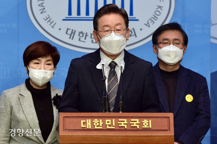 이 후보는 이날 국회에서 기자회견을 열고 이같이 말했다. 이 후보는 “저는 국민의힘이 제안한 35조원 규모의 소상공인·자영업자 지원을 위한 추경(추가경정예산) 편성에 100% 공감하고 환영한다”면서도 “(국민의힘은) 지출·예산 구조조정을 통해서 (재원을 마련하자라는) 단서를 붙였다. 정부에 조건을 달아서 사실상 35조 추경 확대를 못하게 하려고 하는 게 아닌가 의문이 든다”고 말했다.
