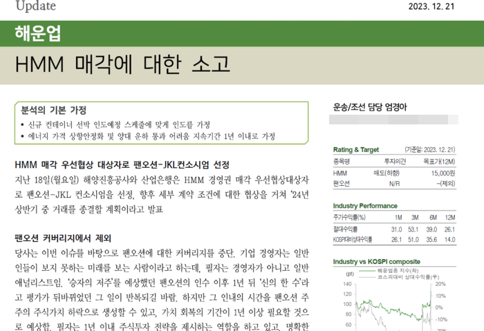 그는 보고서에 “‘승자의 저주’를 예상했던 (하림의) 팬오션 인수 1년 뒤 ‘신의 한 수’라고 평가가 뒤바뀌었던 그 일이 반복되길 바란다”라며 자신의 분석이 틀리기를 바란다는 취지의 직설적인 표현도 담았다. 파장은 작지 않았다.