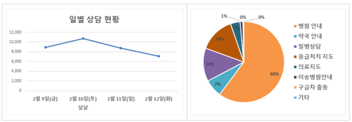 지난해 설 연휴 가장 많은 상담 건수는 병원 안내 요청으로 총 2만1357건이었다. 설 연휴 상담 건수의 약 60%였다. 응급처치 지도(5021건)과 질병 상담(4728건), 약국 상담(2513건) 등이 뒤를 이었다.