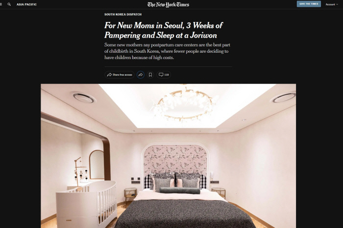 NYT는 한국식 산후조리 서비스를 미국에서 누리면 좋겠다는 한국계 미국인의 희망도 전했다. 그러면서도 “조리원의 산후조리 수준은 정말 훌륭하지만 그 기간은 2주에 불과하다. 사람들이 출산을 꺼리는 이유는 그 이후의 삶 때문”이라고 한 다른 한국 여성의 발언도 함께 소개했다.