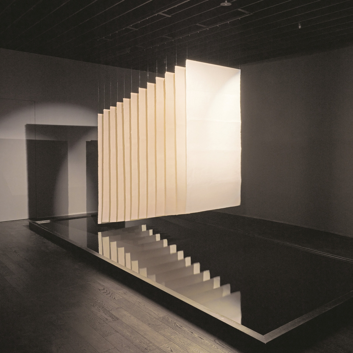 전시의 중간마다 현대미술 작품이 함께 소개된다. 송수남의 ‘붓의 놀림’(1995)과 서세옥의 ‘사람’ 연작 2점(1990·1998)은 먹의 농담과 선을 현대의 추상적인 표현으로까지 확장해냈다. 이배의 ‘불로부터’ 연작 2점(2003)은 숯의 색과 질감으로 오랜 기간 이어져 왔던 검은색 표현을 확장해냈다. 전시를 위해 제작된 김호득의 대형 설치 신작 ‘흔들림, 문득 공간을 그리다’(2025)는 외부의 빛이 차단된 전시 공간 바닥에 큰 벼루를 놓아 먹물을 가두고 그 위에 대형 한지 10여 장을 매달아뒀다. 내부에서 비추는 빛 덕에 한지 뒤편에 지는 그림자는 전에 보지 못한 새로운 산수화처럼 보이기도 한다.
