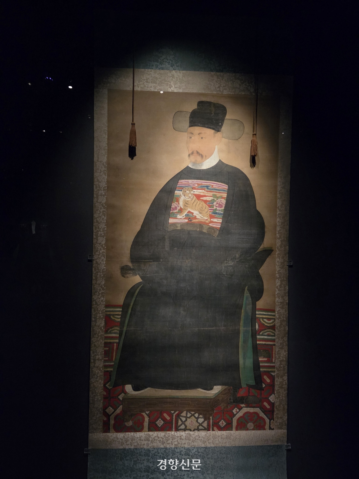 그 의미를 짐작게 하는 것이 보물인 ‘박유명 초상’(1623년경)이다. 그가 입은 검은 옷은 흑단령이 다. 인조반정에 참여한 무인 박유명(1582~1640)은 공신으로 인정받은 뒤 초상화를 남기게 된다. 바닥의 무늬, 배에 그려진 호랑이의 자태는 박유명이 입은 흑단령의 높은 지위를 가늠케 한다. 조선 초기 조정의 의식 때 입는 색상은 정해져 있지 않았으나, 1446년 <세종실록>에는 국정을 의논하는 회의에 착용할 단령의 색을 검은색으로 한다는 기록이 있다. 이것이 흑단령의 시작이다. 시간이 지나며 미세한 변화는 있었지만 검은 기운이 돈다는 점은 바뀌지 않았다. 지난달 27일까지 전시 후 반환됐던 보물인 ‘이하응초상 흑단령표본’(1869)에서도, 당대 실력자인 흥선대원군 이하응이 입은 흑단령이 보인다. 19세기에 쓰인 흑단령도 전시돼 있다.