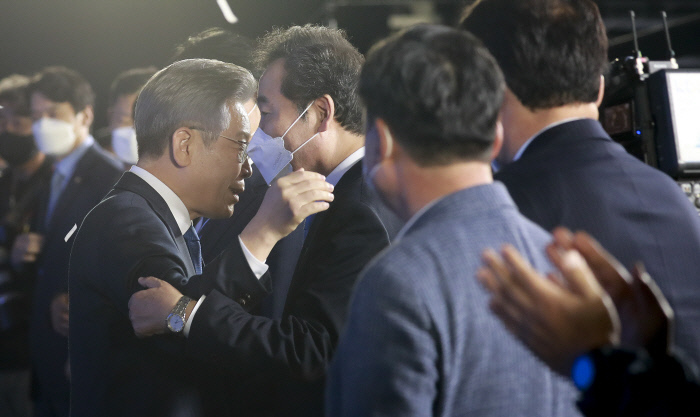 이 지사는 누적득표수 71만9905표(누적득표율 50.29%)로 민주당 최종 후보가 됐다. 전날 경기지역 경선까지만 해도 누적득표율 55.29%로 안정적 과반을 달리던 득표율이 5%포인트 급락했다. 3차 국민선거인단 투표 결과 때문이다.