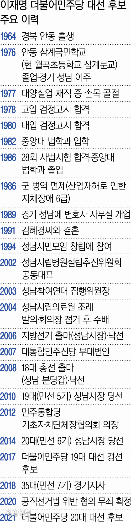 ‘변방의 장수’. 더불어민주당 대선 후보로 10일 최종 선출된 이재명 경기지사(57)를 지칭하는 대표적인 말이다. 그의 정치여정 주무대는 여의도 국회가 아닌 경기도와 성남시였다. 10대 시절을 공장에서 보내며 산업재해를 당하고 중·고등학교 졸업 학력을 모두 검정고시로 마쳤던 삶의 궤적도 변방이었다. 하지만 장수의 칼날은 변방에서도 예리했고, 때로는 영리했다. 사회관계망서비스(SNS)를 적극적으로 활용해 사이다 발언을 거침없이 터뜨리며 지지자들의 마음을 사로잡았다. 코로나19가 국내에 처음 확산되던 지난해 2~3월 신천지예수교증거장막성전(신천지) 시설을 강제 봉쇄하고 전 도민에게 재난기본소득을 지급하는 결단으로 지역 주민들의 뇌리에 ‘일 잘하는 행정가’의 면모를 각인시켰다. 특별한 정치적 후광이나 계파가 없던 그가 집권여당 대선 후보로 발돋움한 비결이다.