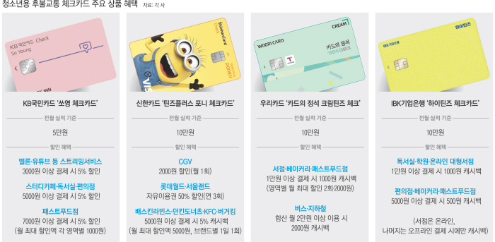 우리카드의 ‘카드의 정석 크림틴즈 체크’는 버스·지하철을 합해 월 2만원 이상 이용할 경우 2000원을 캐시백해준다. 서점, 편의점, 패스트푸드점 등에서 1만원 이상을 결제하면 1000원을 캐시백해준다. 단, 서점이나 편의점, 패스트푸드점 등 항목별로 월 2회까지만 할인이 가능하다. IBK기업은행의 ‘하이틴즈 체크카드’는 독서실과 학원·온라인서점에서 1만원 이상 결제할 때 1000원을 할인해준다. 편의점, 베이커리, 패스트푸드점에서 5000원 이상 결제할 때는 500원을 할인해준다. 교보문고, 반디앤루니스 등 대형서점 할인 혜택은 온라인 구매 시에만, 다른 업종의 경우 오프라인 구매 시에만 할인 혜택을 주는 등 항목별 할인 조건에 차이가 있다. 이 밖에 하나카드는 ‘리틀프렌즈 틴에이저 체크카드’, DGB대구은행은 ‘DGB 똑디 후불교통 체크카드’ 등을 각각 내놨다.