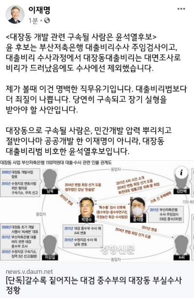 이 후보는 글과 함께 이날 오전 공개된 경향신문 보도 링크를 걸었다. 이날 경향신문 1·6면에 실린 해당 기사는 2011년 대검찰청 중앙수사부가 부산저축은행의 1100억원대 대장동 프로젝트파이낸싱(PF) 대출 건을 제대로 수사하지 않은 정황이 있다고 지적하고 있다. 대출을 알선한 A씨가 대출 대가로 10억3000만원을 받은 사실을 검찰이 확인하고도 후속 조치가 없었다는 것이다. 윤석열 국민의힘 대선 경선 후보는 당시 대검 중수2과장으로 이 사건 수사 주임검사였다. 윤 후보 캠프는 “당시 명백한 알선수재 혐의가 입증됐다면 처벌하지 않았을리 없다”며 봐주기 수사 의혹에 대해 “결코 그런 사실이 없다”고 해명했다.