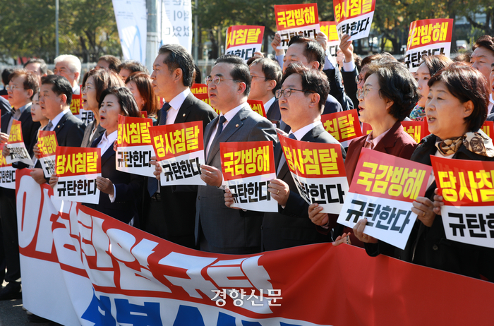 민주당은 이날 오전 10시부터 예정된 국회 상임위별 종합 국정감사에 불참하고 긴급 의원총회를 열었다. 그 여파로 이날 오전 국감은 대부분 열리지 못했거나 일찍 중단됐다. 민주당은 의총 후 용산 대통령실 앞에서 항의 기자회견을 했다. 이재명 대표는 참석하지 않았다. 박 원내대표는 기자회견에서 “검찰 수사의 진두지휘는 윤 대통령과 대통령실이 맡았다고 확신한다”면서 “이것은 협치를 거부하는 정도가 아니라 야당을 말살하고야 말겠다는 뜻”이라고 말했다. 또 “저희는 중앙당 압수수색에 대해서도 ‘자발적으로 수사에 협조하겠다’고 누누이 얘기했는데 누가 걷어찼냐”면서 “저희로서는 이제 협치는 끝났다고 생각한다”고 말했다.