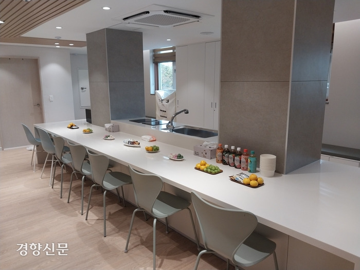 주방 및 식사 공간으로 쓰이는 공용공간에는 직사각형 형태의 긴 고정 테이블을 설치해 독립적인 식사가 가능하도록 했다. 테이블 한켠에는 싱크대와 수전, 인덕션이 함께 붙어있는 구조라 장애인 스스로 간단한 과일세척 등 식사준비 참여가 가능하도록 했다.