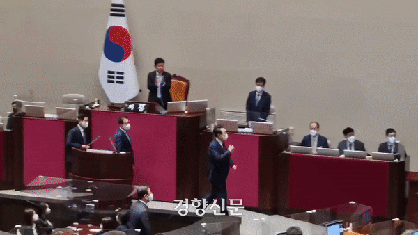 윤 대통령이 총 18분 28초 동안 연설하는 동안 국민의힘 의원들은 19차례 박수를 보내며 호응했다. 1분에 한 번꼴로 손뼉을 친 것이다. 일부 여당 의원은 휴대전화를 들고 윤 대통령을 촬영했다. 윤 대통령이 “누구도 넘볼 수 없는 강력한 국가를 만들겠다”고 말한 대목에서 박수와 환호성이 터져 나왔다.