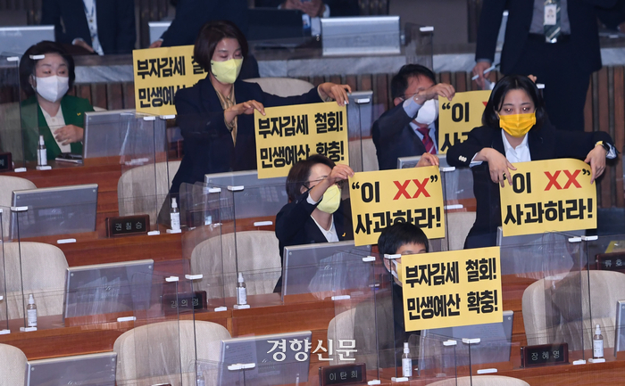 정의당은 25일 윤석열 대통령이 시정연설을 한 국회 본회의에 참석해 팻말을 게시하며 국회 모욕에 대한 사과를 요구했다. 야당이 본회의장을 비우고 파행 모양새를 만드는 것이 오히려 윤 대통령을 돕는 일이라 판단했기 때문이다.