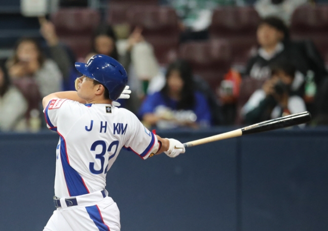 한국 야구 대표팀 김재환이 2019 프리미어 12를 앞두고 치르는 평가전에서 홈런포를 쐈다.