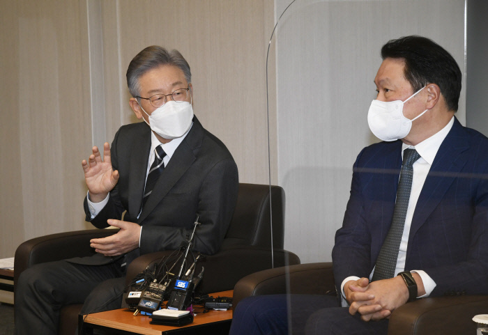 이 후보는 이날 서울 중구 대한상의를 방문해 최태원 대한상의 회장(SK 회장)과 지역 주요 상의 회장들을 만났다. 이 후보는 최 회장에게 “SK도 경기도에서 사업해서 아시겠지만, 경기도가 매우 친기업적으로 절차도 생략하고 많이 지원했다”며 “매일경제신문의 광역단체장 이미지 조사에서 비교도 안될 정도로 1등 했는데 잘 몰라주시는 것 같다”고 말했다. 이 후보는 경기 시흥시에 들어선 인공서핑장 웨이브파크의 예를 들며 “부산 기업이 검토만 2년 6개월 했는데, 경기도로 유치해서 부지 매입부터 준공·개장까지 딱 2년 6개월이 걸렸다”며 성과를 강조하기도 했다.