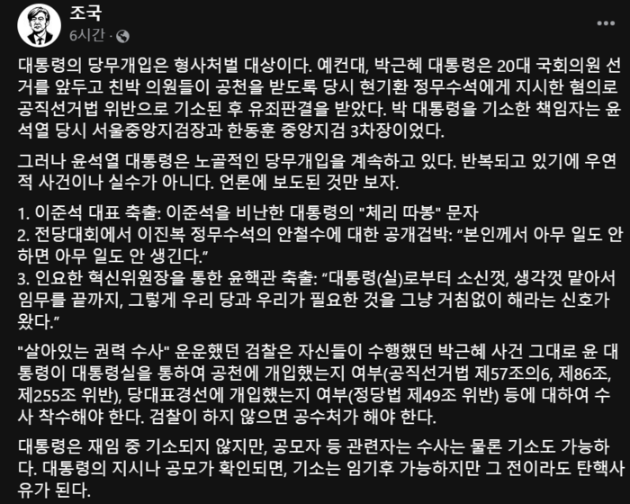 조 전 장관은 “대통령의 당무개입은 형사처벌 대상”이라며 “박근혜 대통령은 20대 국회의원 선거를 앞두고 친박(근혜) 의원들이 공천을 받도록 당시 현기환 (청와대) 정무수석에게 지시한 혐의로 공직선거법 위반으로 기소된 후 유죄판결을 받았다”고 썼다. 그는 “박 대통령을 기소한 책임자는 윤석열 당시 서울중앙지검장과 한동훈 중앙지검 3차장”이라고도 했다.