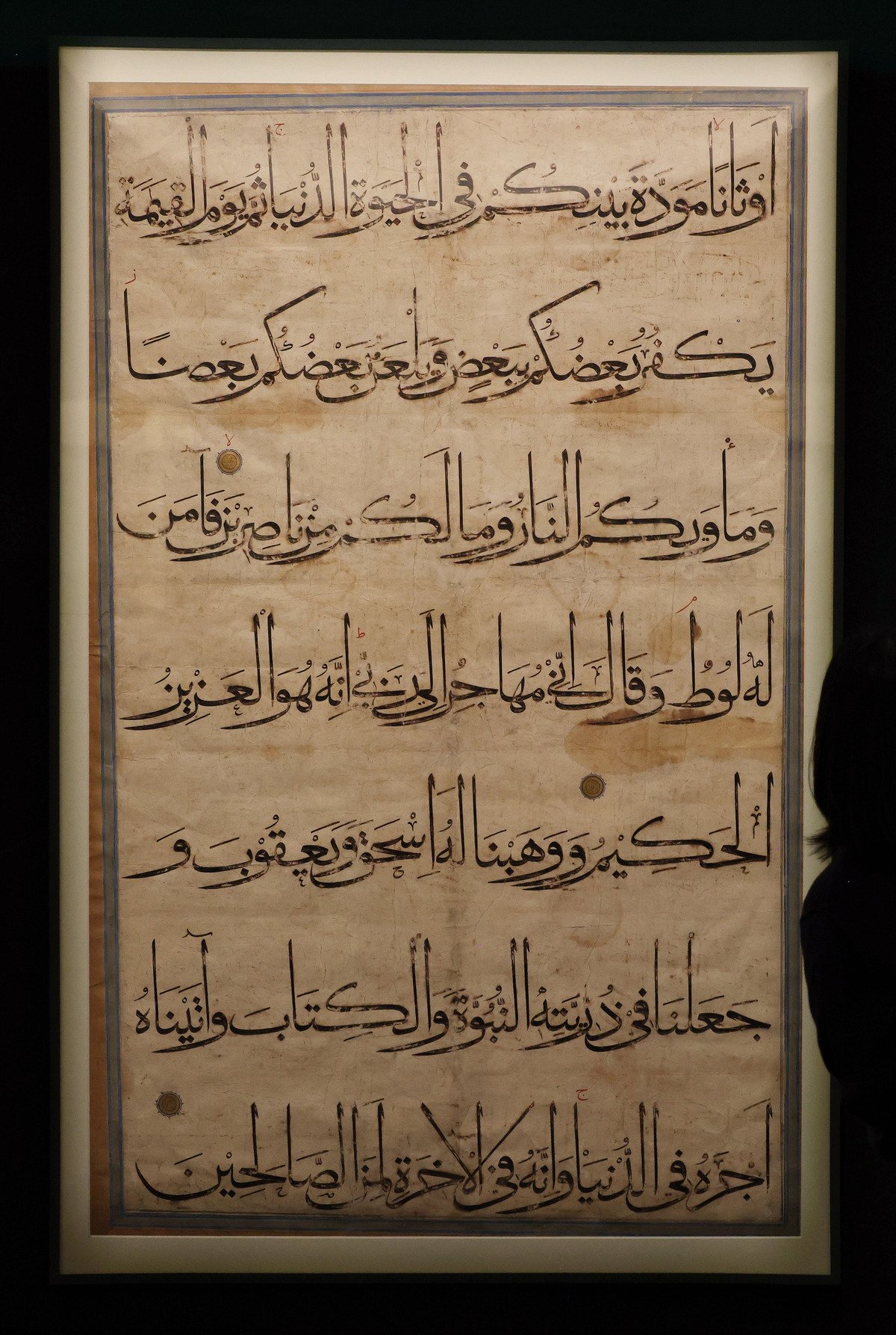 현존하는 가장 큰 규모의 필사본 중 하나인 대형 쿠란 필사본은 이슬람 예술의 특징을 살펴볼 수 있는 좋은 예다. 15세기 초 중앙아시아에 있던 티무르 제국의 창시자 티무르가 주문한 것으로 알려진 이 쿠란 필사본 중 한 장은 높이가 성인 키에 맞먹는 177.0㎝일 정도로 규모가 크다. 큼직하게 채운 글씨는 정밀하기까지 한데, 우상으로 발전할 수 있는 상징물을 허용하지 않던 이슬람 문화 특성 때문에 글씨와 서예가들의 위상이 높았다. 이슬람 등장 직후인 7세기 후반~8세기 초에 만들어진 것으로 추정되는 초기 쿠란 필사본은 내구성이 높은 양피지에 쓰여 지금까지 전해져 와 이슬람실에서 관람객을 기다리기에 이르렀다.