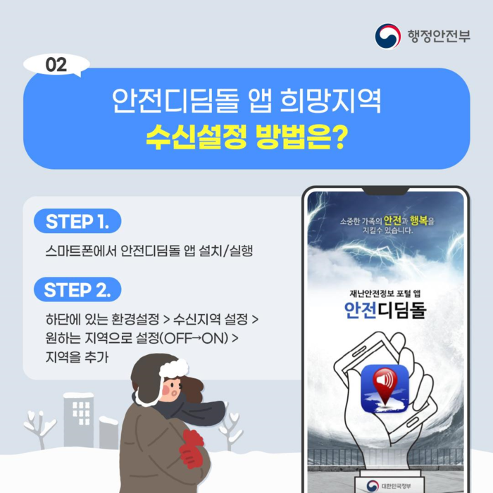행정안전부는 25일 안전디딤돌 애플리케이션의 ‘수신지역 설정’ 기능을 통해 멀리 사는 가족의 재난문자를 받고 노년층의 한랭질환을 예방할 수 있다고 밝혔다.