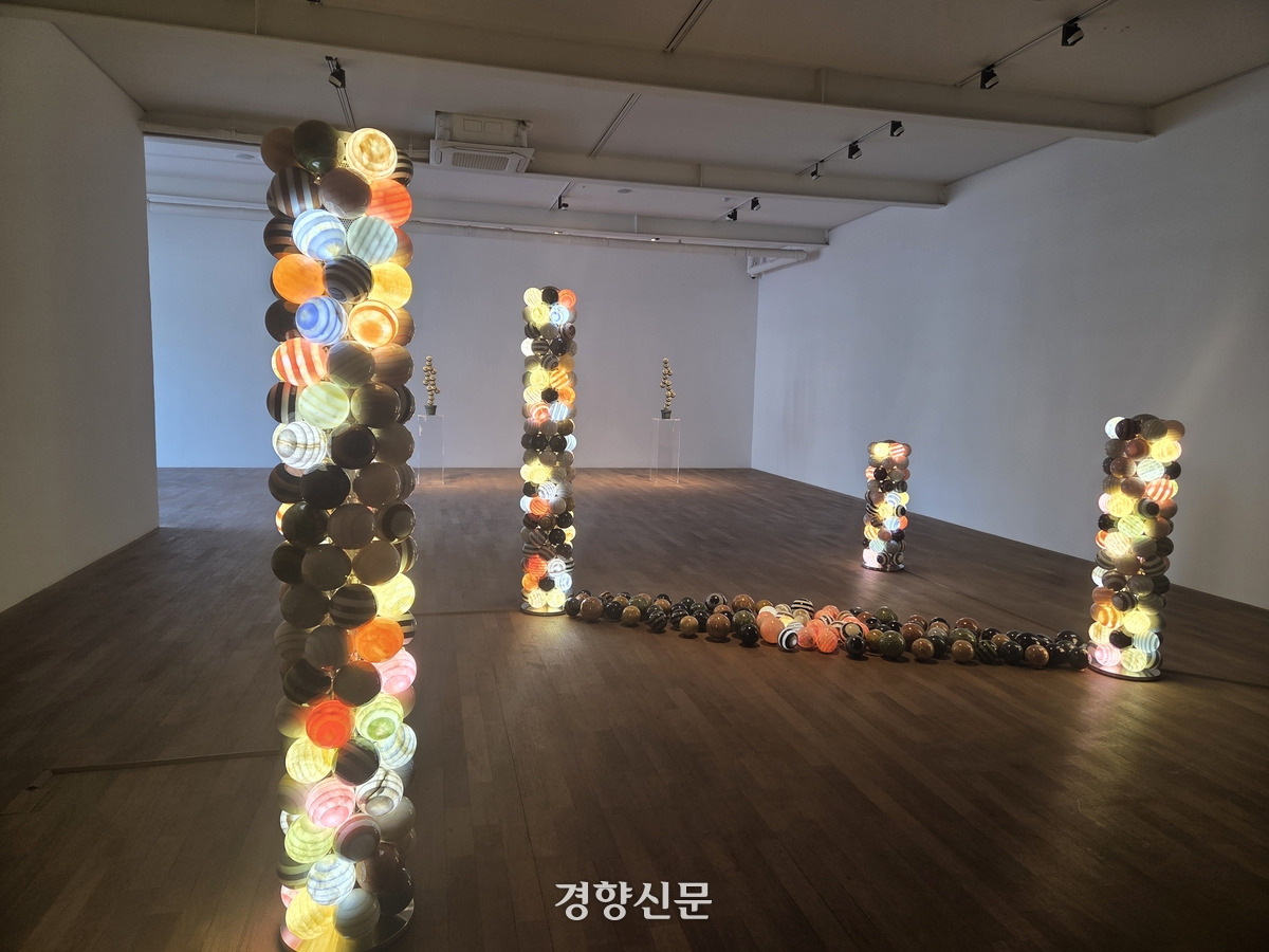 ‘빛’을 더한 것은 ‘무한기둥-확산’ 연작(2025)이다. 코로나19가 창궐했던 2020년대 초, 박은선이 머물던 이탈리아는 확산세가 심한 대표적인 나라였다. 그는 코로나19로 밖으로 나가지 못한 채 작업에 몰두하다 함께 하는 가족을 보며 그 소중함을 깨달았다고 한다. 1993년부터 이탈리아로 건너가 활동했던 박은선은 “나를 도와주고, 나를 존재하게 만든 이탈리아의 친구들에게 내가 줄 수 있는 게 뭘까 생각했다”며 “‘희망을 줄 수 있는 작업을 해보자’고 생각하다 빛을 보게 됐다”고 말했다. 돌을 깎아 만든 구 안에서 다양한 색으로 빛나는 LED 조명은 자연석을 거쳐 밖으로 투과되며 따뜻한 느낌을 낸다.
