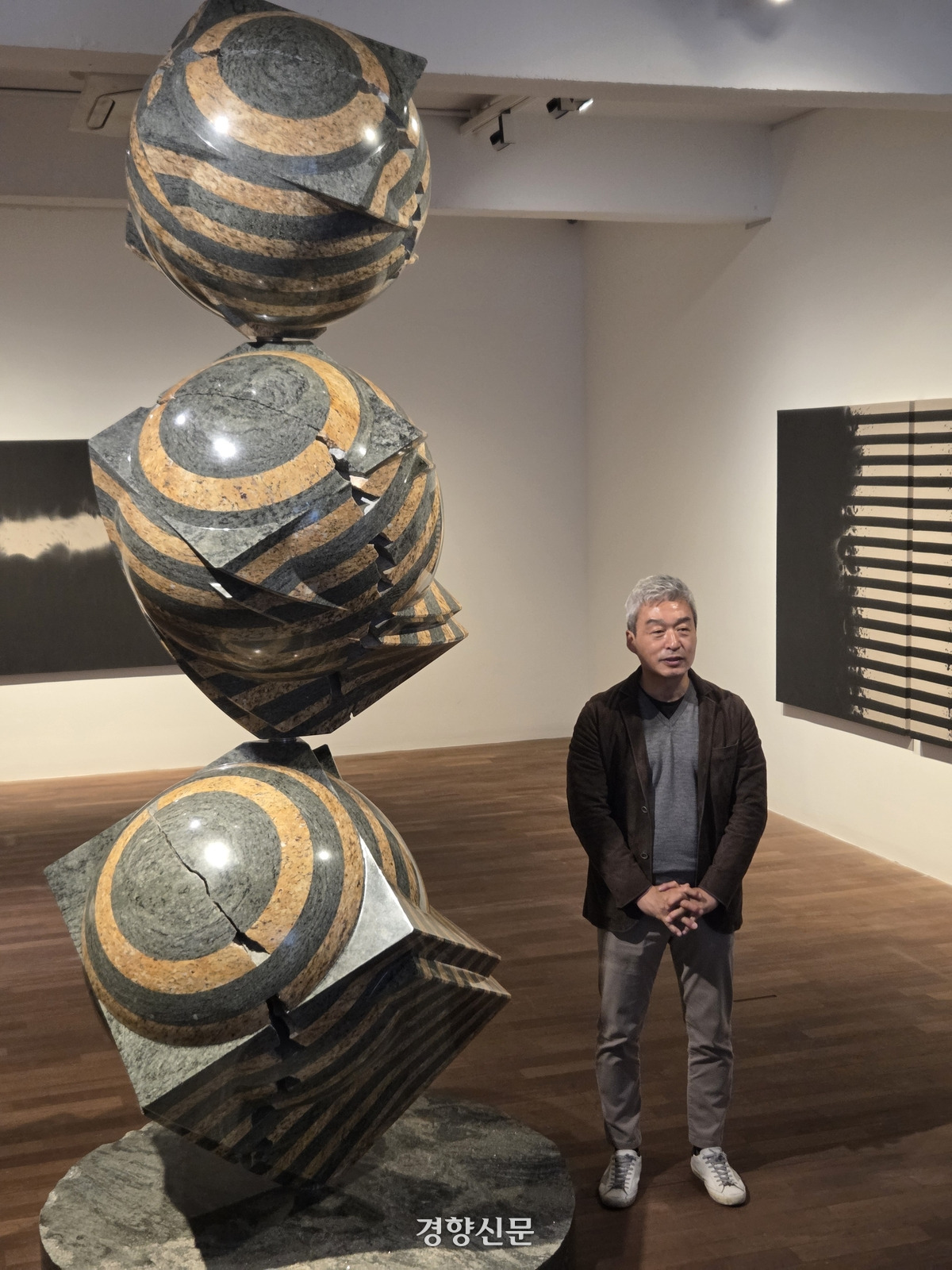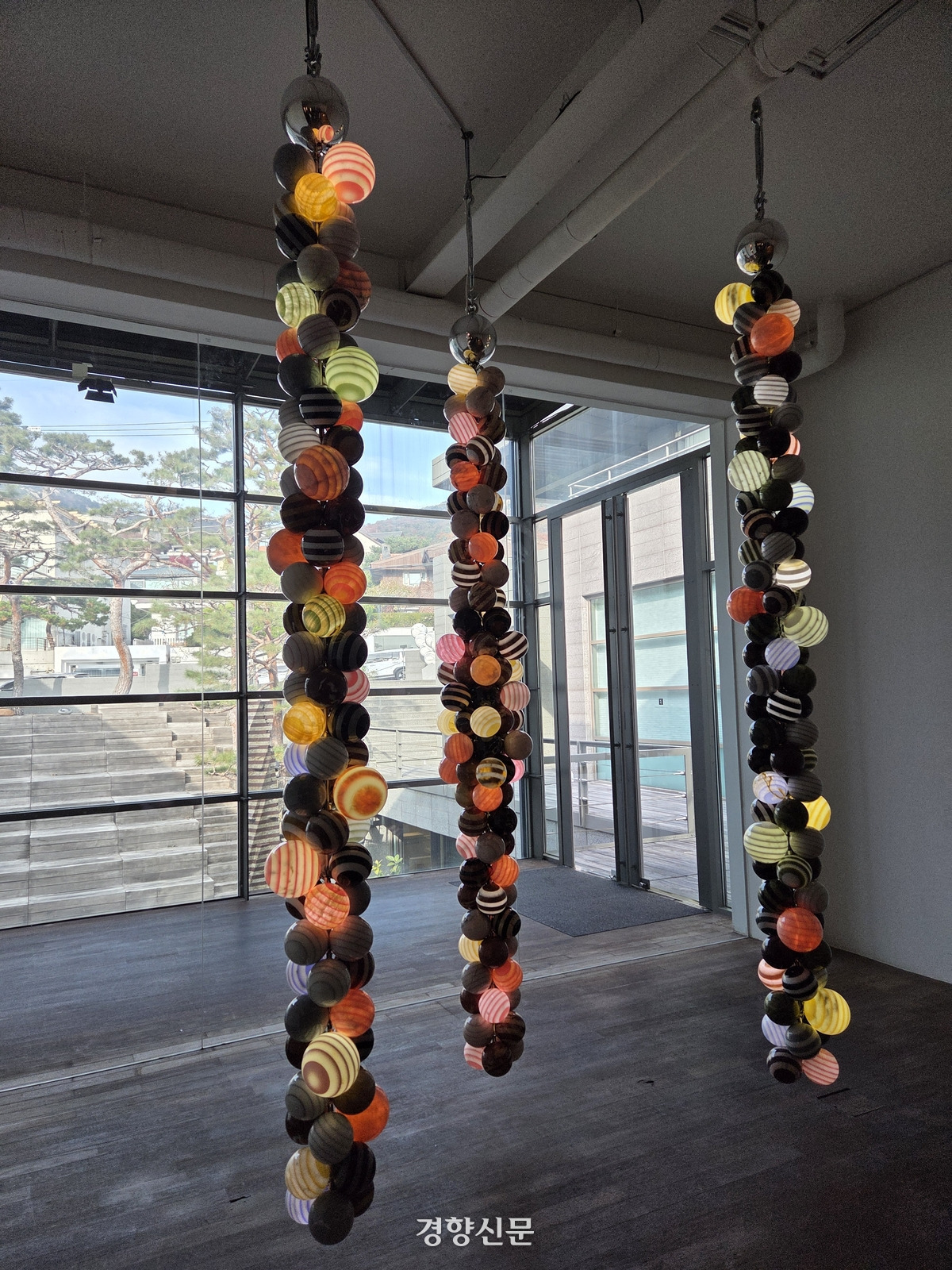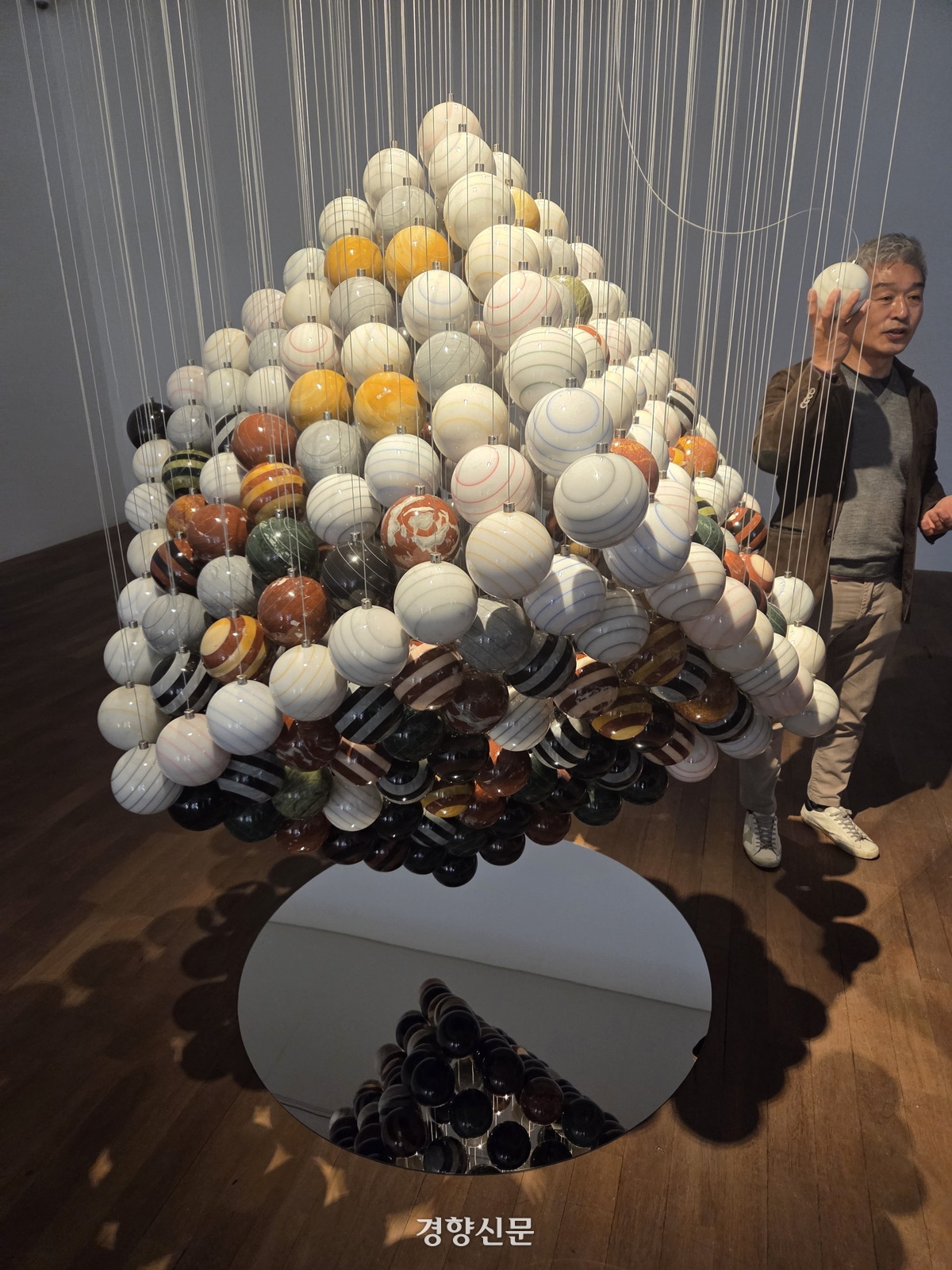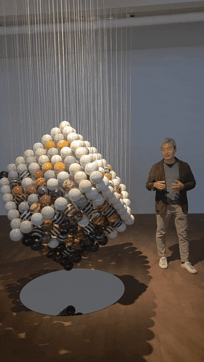 천장에 매달린 구슬이 정육면체를 이룬다. 서울 종로구 가나아트센터에서 작가 박은선(60)이 선보인 ‘정육면체’(2025)는 296개의 구로 반듯하게 짜인 정육면체의 형상을 띄고 있다. 높이가 2.5m에 이르는 대형 조형물은 박은선의 예술 세계가 집약돼 있다. 구와 사각형, 그가 조각으로 선보이길 원했던 순수함과 맞닿은 요소들이다.