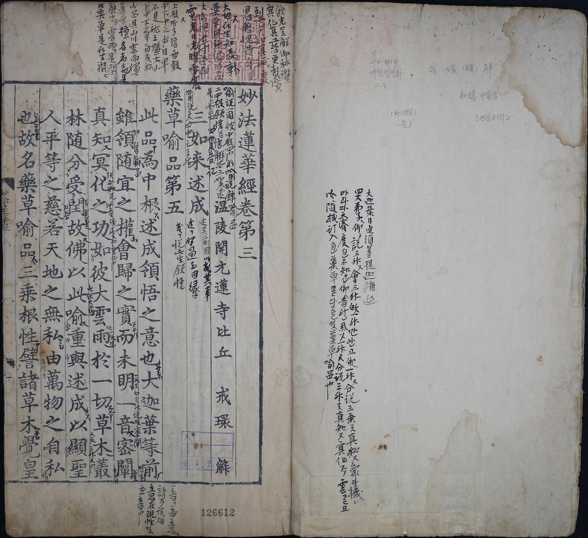천태종의 근본 경전인 <묘법연화경> 권3은 인도 승려 구마라집이 한역한 것을 송나라 승려 계환이 주해한 전7권 중 권3의 1책이다. 1450년(세종 32년) 세종의 명령으로 조선에서 생산된 왜저지에 초주갑인자로 찍어 만든 금속활자본으로 15세기 왕실의 간행본을 이해하는 데 중요한 자료다.
