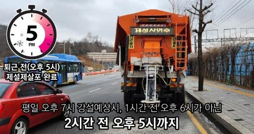 서울시는 많은 눈이 오리라 예상되는 날 출퇴근 차량정체가 발생하지 않도록, 오전에는 출근 시간 전인 오전 6시까지, 오후에는 퇴근 시간 전인 오후 5시까지 제설제 살포를 완료하기로 했다. 폭설이 내리면 제설 차량을 긴급자동차로 등록해 중앙버스전용차로로 이동할 수 있게 조치하기로 했다.