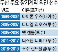 외인 도입 첫 해 한 시즌 홈런 신기록(당시 42개)을 새로 세운 타이론 우즈는 2002년까지 두산 유니폼을 입었다. 김동주, 심정수와 이룬 ‘우동수 트리오’는 베어스 뚝심 야구의 상징과도 같았다. 우즈가 일본으로 떠난지 얼마 지나지 않아 두산에는 다니엘 리오스-맷 랜들이라는 장수 원투펀치가 등장했다. 2005년 도중 리오스가 KIA에서 트레이드돼 결성된 듀오는 리오스가 2007시즌 후 일본 진출하기까지 유지됐다. 랜들은 2009시즌 개막 전 지하철역 계단에서 미끄러지는 불의의 부상을 당하지 않았다면 두산 선수로 더 오래 남았을 것이다.