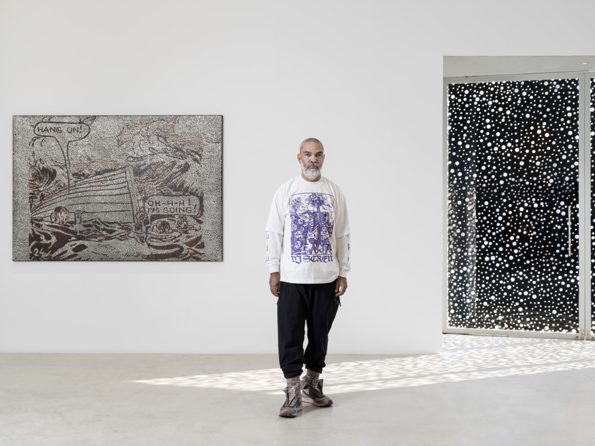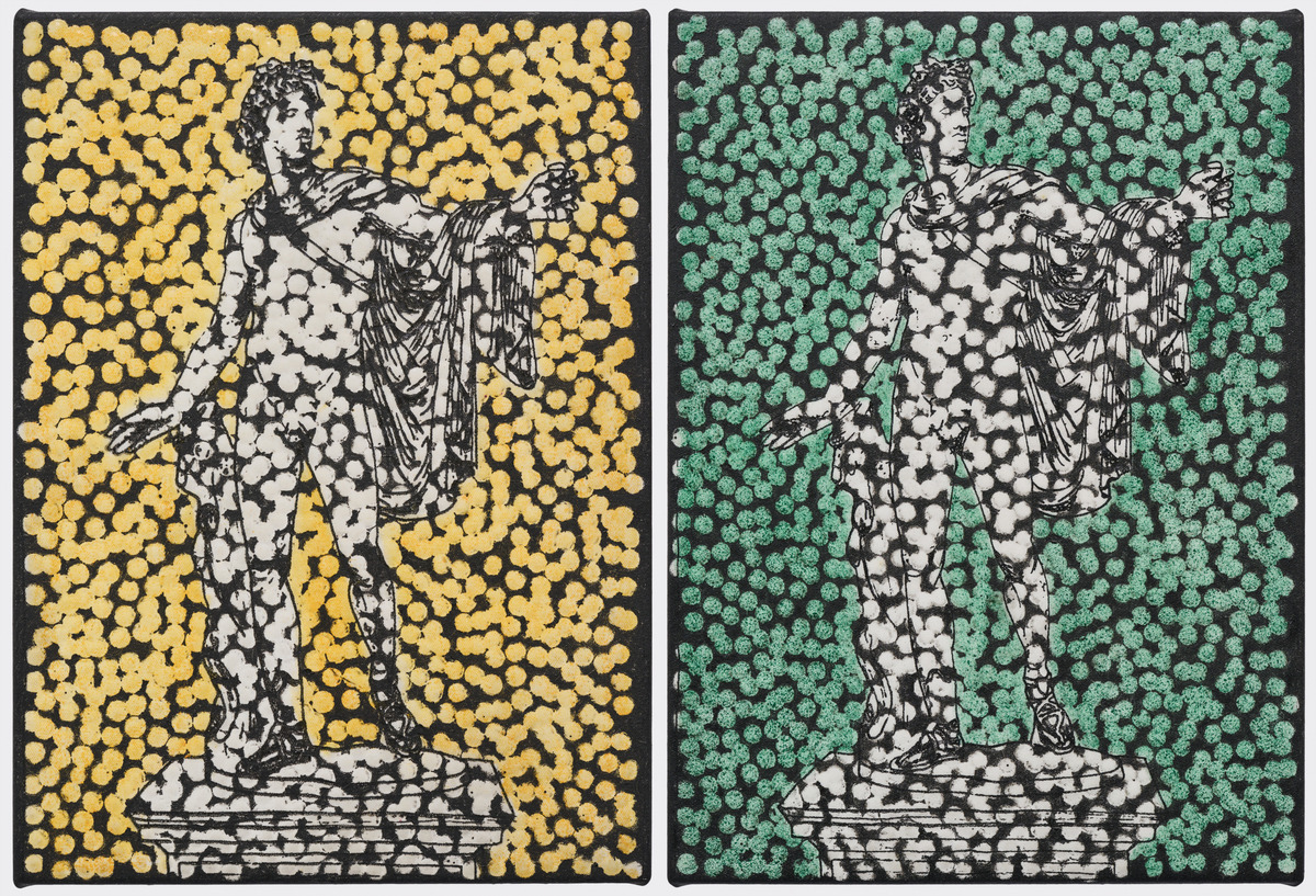 ‘무제(PCSAIMTRA)’(2025)는 취조실에서 주로 쓰이는 단방향 거울 5개에 보이드 특유의 빈 원을 여럿 새겨 넣었다. 호주 대륙을 처음 밟은 백인들, 호주를 찾은 관광객들이 원주민을 구경겨리처럼 여겼던 역사가 떠오른다. 흰 포세이돈 조각상을 그려 놓고 특유의 검은 점을 그려 넣은 또다른 ‘무제’ 연작 2점에서는 그리스·로마 때의 조각상을 모두 흰색으로 칠한 뒤 전시했던 대영박물관의 관행을 비튼다. 어떤 전설은 그 본질이 아름답지만, 백인 식민주의자들은 그 본질을 제 맘대로 해석하려고 했다.