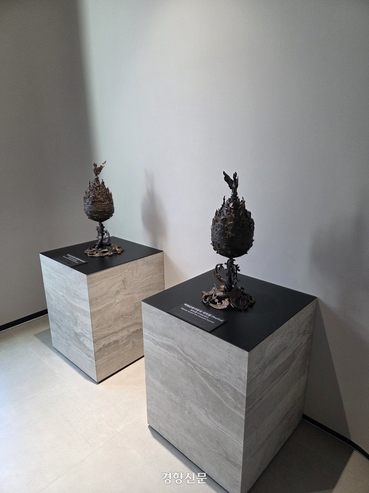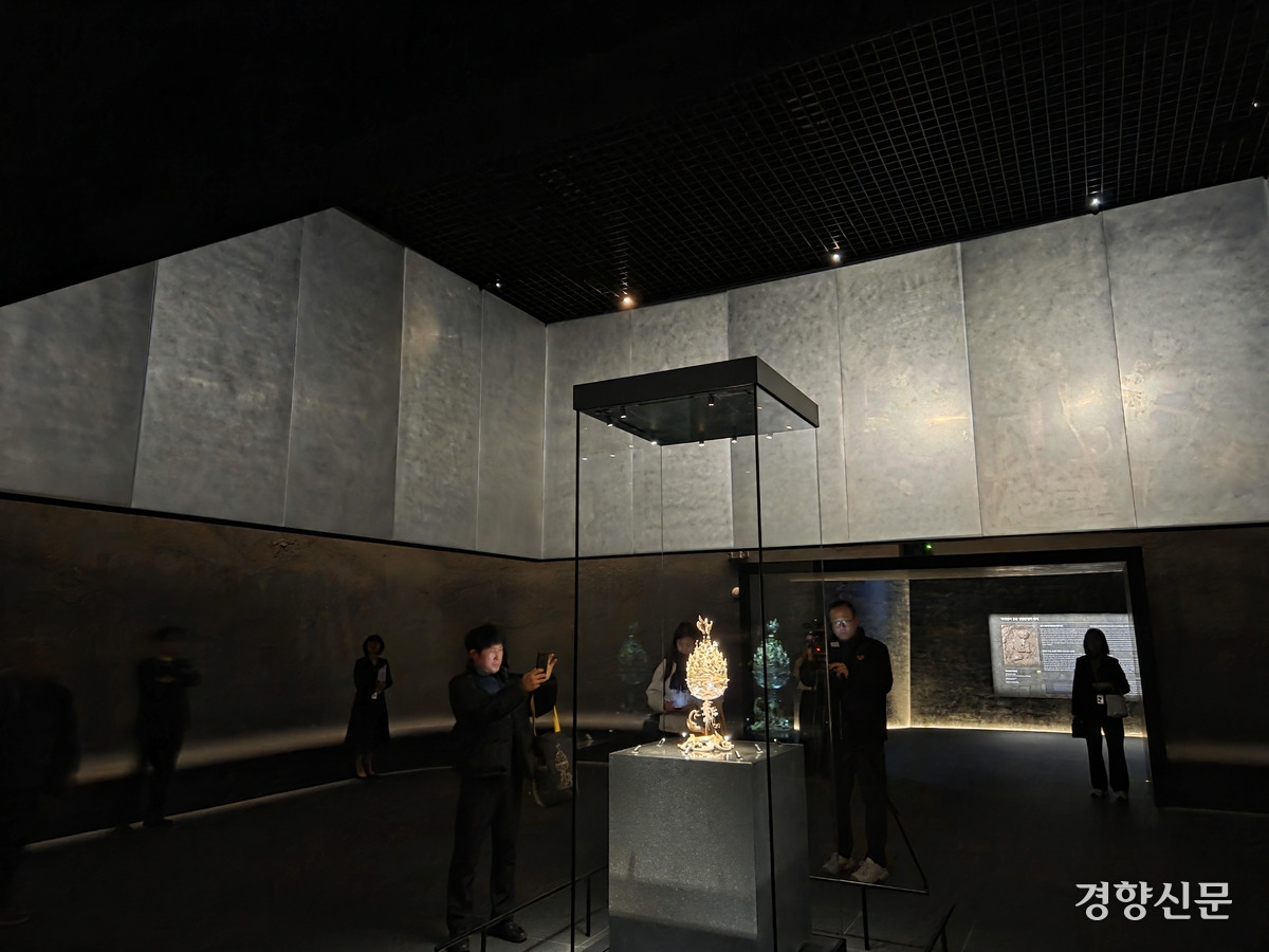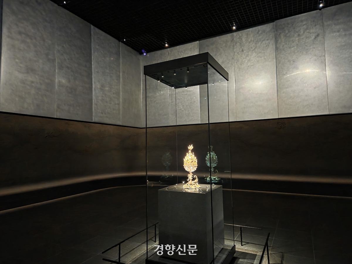 박물관 본관과 연결된 내부 통로를 지나 백제대향로관의 에스컬레이터를 타고 3층에 오르면 ‘백제금동대향로실’에 닿는다. 백제대향로관 개관을 하루 앞둔 22일 언론에 공개된 전시실은 어두운 조명 한가운데 금동대향로가 배치된 약 254㎡(77평) 공간이었다. 유리 찬장 속의 높이 62.3㎝, 몸체 지름이 약 19㎝인 금동대향로는 찬장의 위아래, 전시장 4m 높이 천장에 설치된 조명을 받아 금동대향로에 새겨진 작은 조각들이 도드라지도록 빛난다.