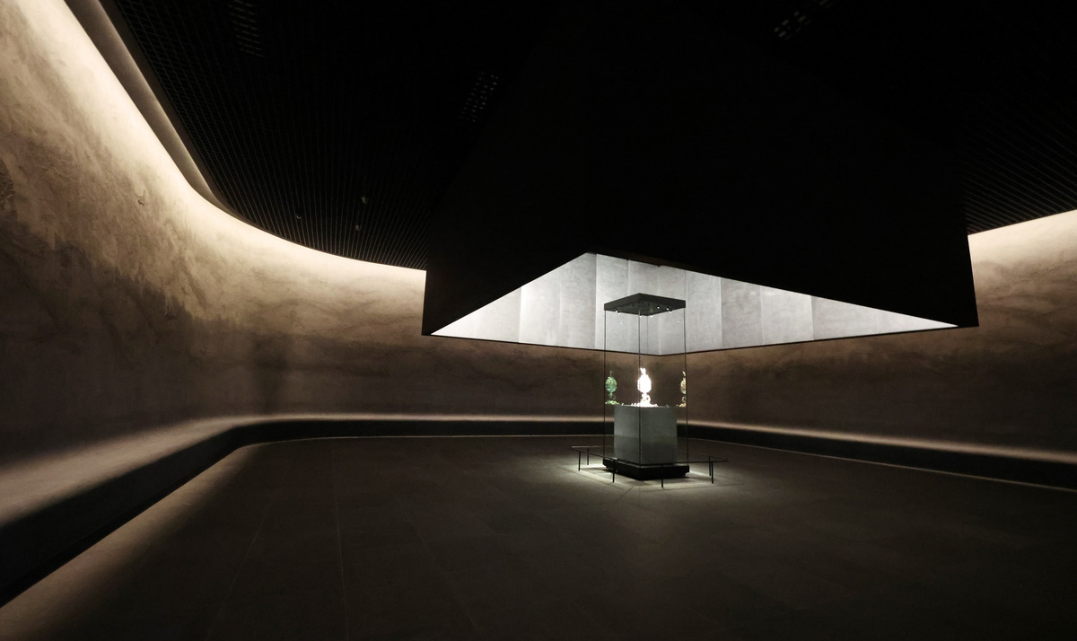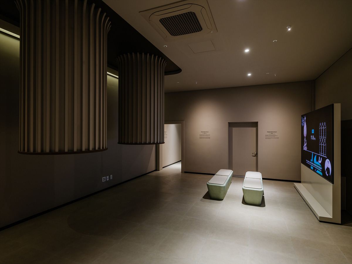 전시실 안팎의 질감이 독특하다. 유리 찬장 위 사방을 둘러싼 금속판은 표면이 거칠게 제작돼 빛을 은은하게 퍼뜨린다. 전시실 내부의 벽은 흙의 거친 질감을 살린 부분과 평평하게 다듬은 부분을 교차하며 무늬를 냈다. 이런 구성은 전시실 내에 연기가 흐르는 듯한 느낌을 준다. 향로의 본질을 생각하게 한다.