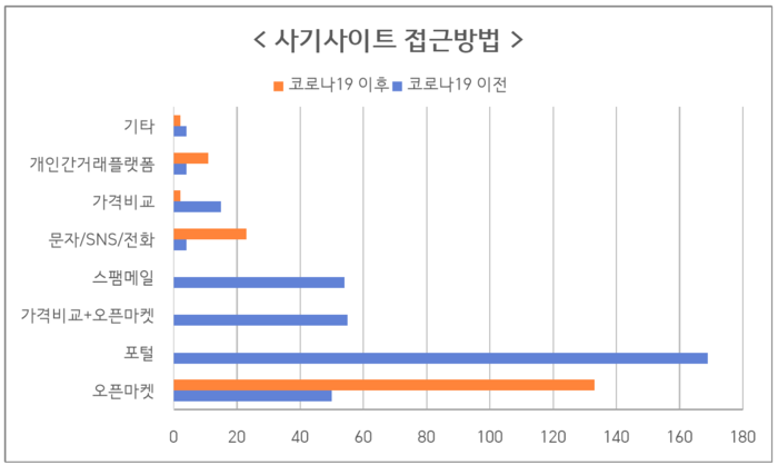 코로나19 팬데믹을 기점으로 사기 인터넷 쇼핑몰의 개설 시기와 사기 품목과 유형이 변화한 것으로 나타났다. 피해 시기는 명절 전후에서 초여름으로 바뀌었고, 잡화와 상품권 사기가 줄어든 대신 스포츠·레저·취미용품, 쇼핑몰 부업 사기가 늘었다.