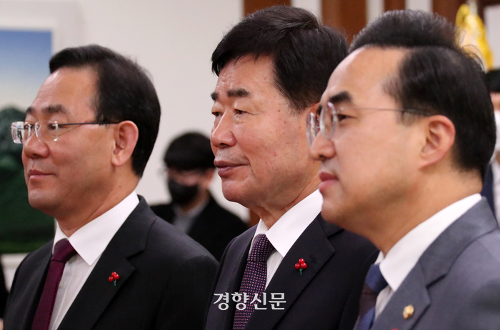 민주당 원내지도부는 8일 국회에서 기자회견을 열고 내년도 예산안과 부수 법안 협상 상황을 설명했다. 김성환 정책위의장은 “1가구 1주택자의 종부세 (공제 기준은) 공시가격 11억원에서 12억원으로, 저가 다주택자는 6억원에서 9억원으로 올리기로 사실상 여야가 합의했다”고 말했다.