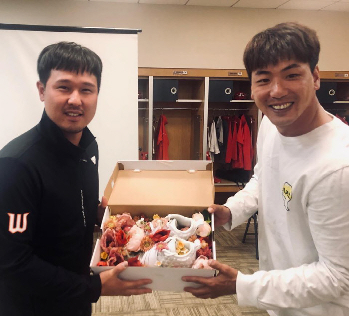 메이저리그 스프링트레이닝 첫 참가를 앞두고 있는 김광현(32·세인트루이스)이 전 소속팀 SK 선수들로부터 ‘꽃신’ 선물을 받았다.