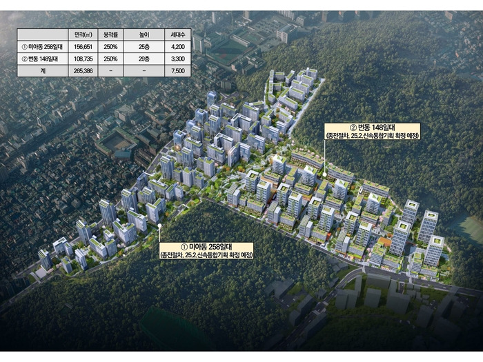 서울시는 강북구 미아동 258번지, 번동 148번지 일대 2곳의 신속통합기획을 이같이 확정했다고 11일 밝혔다. 신통기획은 민간 주도 재개발·재건축 계획 단계에 서울시가 개입해 사업의 공공성을 보완하고 속도를 높이도록 돕는 제도다.