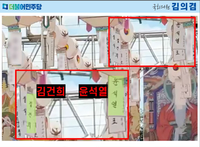 김 의원은 행사장에 걸린 등 중 ‘코바나콘텐츠 대표 김건희’가 적힌 것과 ‘서울중앙지방검찰청 검사장 윤석열’이 적힌 등을 확인했다고 주장했다. 김 의원은 “일반적인 불교행사에 등장하는 연등이 아니다. 삼족오로 보이는 새의 문양과 태극무늬가 그려진 생소한 형태의 등”이라며 “불교보다는 무속에 가깝다”고 말했다. 김 의원은 또 “행사에 걸린 등이 많은 것도 아니다. 부부는 상당한 액수의 등값을 냈을 것으로 추정이 된다”고 주장했다.