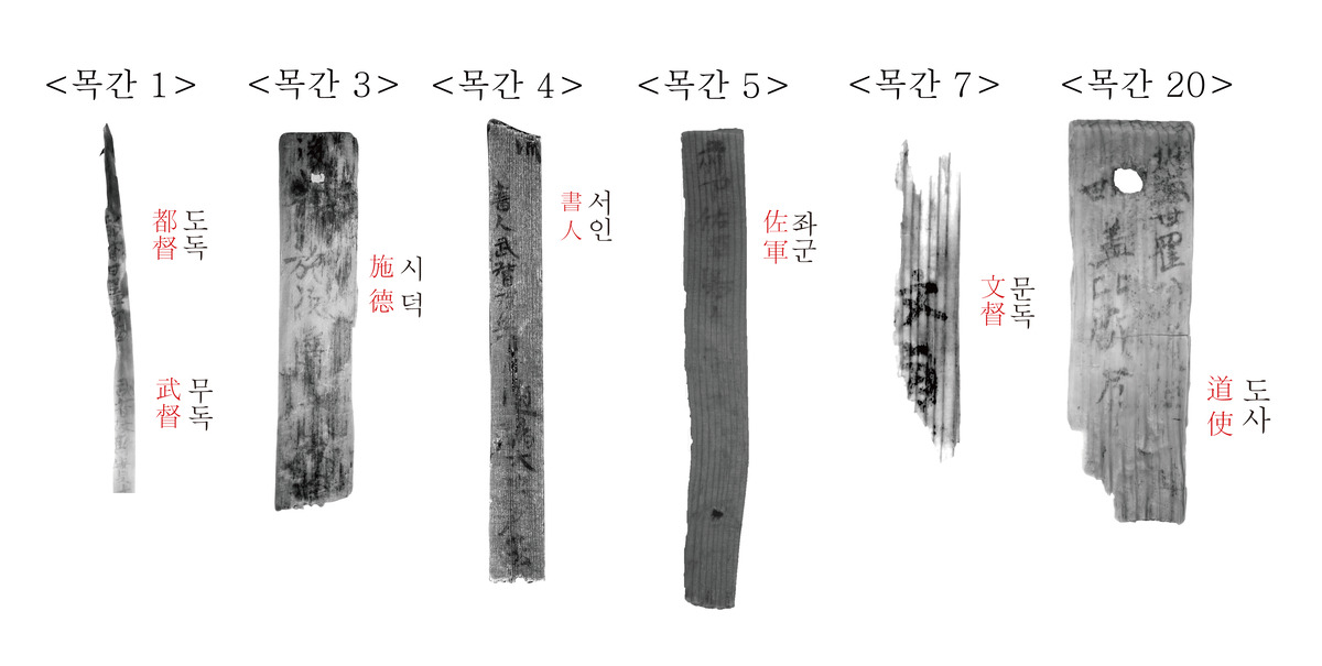 목간에는 새로운 관등 및 관직명이 쓰인 것도 있다. ‘都督’(도독), ‘旅武’(여무), ‘書人’(서인) 등이다. 백제는 관인의 서열을 16관등으로 구분했는데, 도독과 여무, 서인은 기존에 알려진 백제의 16관등에는 없는 명칭이다. 이를 바탕으로 백제 관제의 실제 운영과 구성을 재검토할 수도 있게 됐다.
