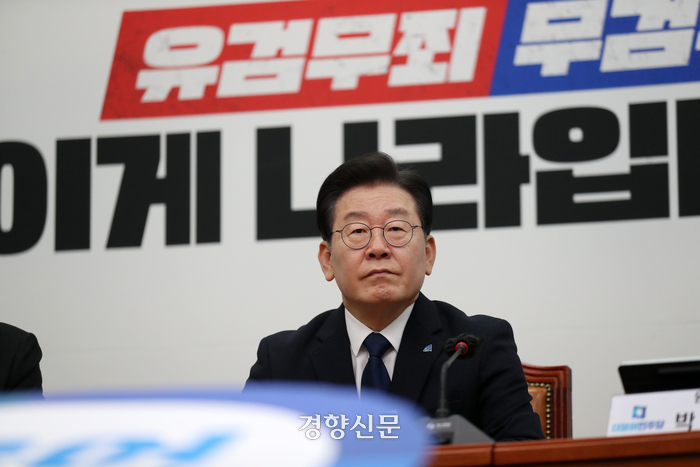 이 대표는 이날 국회에서 열린 민주당 전국 지역위원장·국회의원 긴급 연석회의에 참석해서 이렇게 말했다. 이 대표는 검찰이 전날 자신에 대한 구속영장을 청구한 데 대해 “재판에서 얼마든지 사실을 규명할 수 있지만, 야당 대표니까 구속해야겠다고 영장에 써 놓는 황당한 나라가 어딨느냐”며 “개인 문제가 아니라 민주주의의 파괴이고 헌정질서 파괴이고 민주공화국의 전도”라고 말했다.