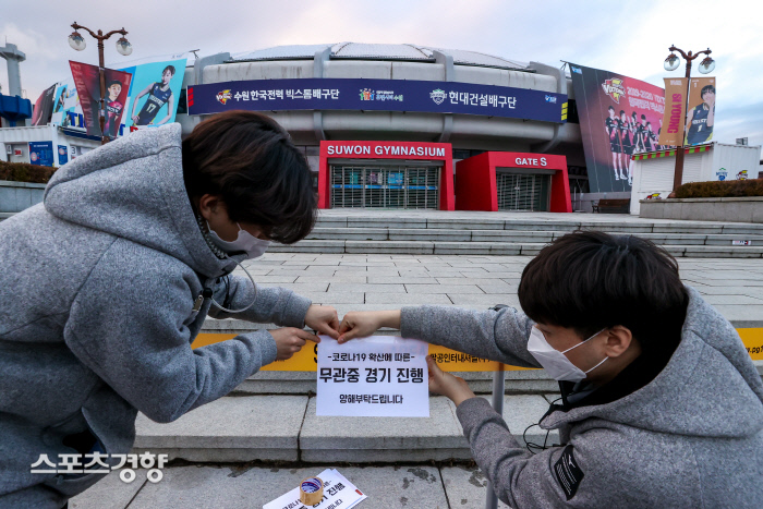 25일 열린 남자부 수원 경기와 여자부 대전 경기부터 무관중 조치가 적용됐다. 불과 이틀 전인 지난 23일 장충에서 열린 여자부 GS칼텍스-현대건설의 1·2위 다툼만해도 관중들이 경기장을 거의 가득 채웠으나 이번에는 관중석이 텅텅 비었다. 경기 시작 2시간 전부터 관중들이 출입하던 주 출입구에는 셔터가 내려졌고 계단 사이에는 출입 통제를 의미하는 노란색 테이프가 길게 붙었다. 취재진 및 관계자들을 대상으로 한 체온 측정은 코로나19 확산 초기에도 있던 일이지만, 이번엔 코트로 통하는 문 앞에 선 관계자가 한 차례 신분 확인을 더 거쳐 경기장에 입장하도록 했다.