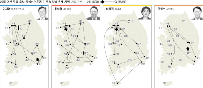 지난 15일 공식 선거운동이 시작된 뒤 28일로 딱 2주째가 됐다. 주요 4개 정당 대선 후보들은 지난 2주 간 전국 각지를 돌며 지지를 호소했다. 각 후보들의 동선을 살펴보면 각자의 지향점이 눈에 띈다. 이재명 더불어민주당 대선 후보는 ‘수도권 집중’이 눈에 띄고, 윤석열 국민의힘 후보는 ‘광폭행보 속 호남 행’을 택했다. 열흘도 남지 않은 남은 선거운동 기간 동안 각 후보들의 유세 전략도 더욱 중요해졌다.