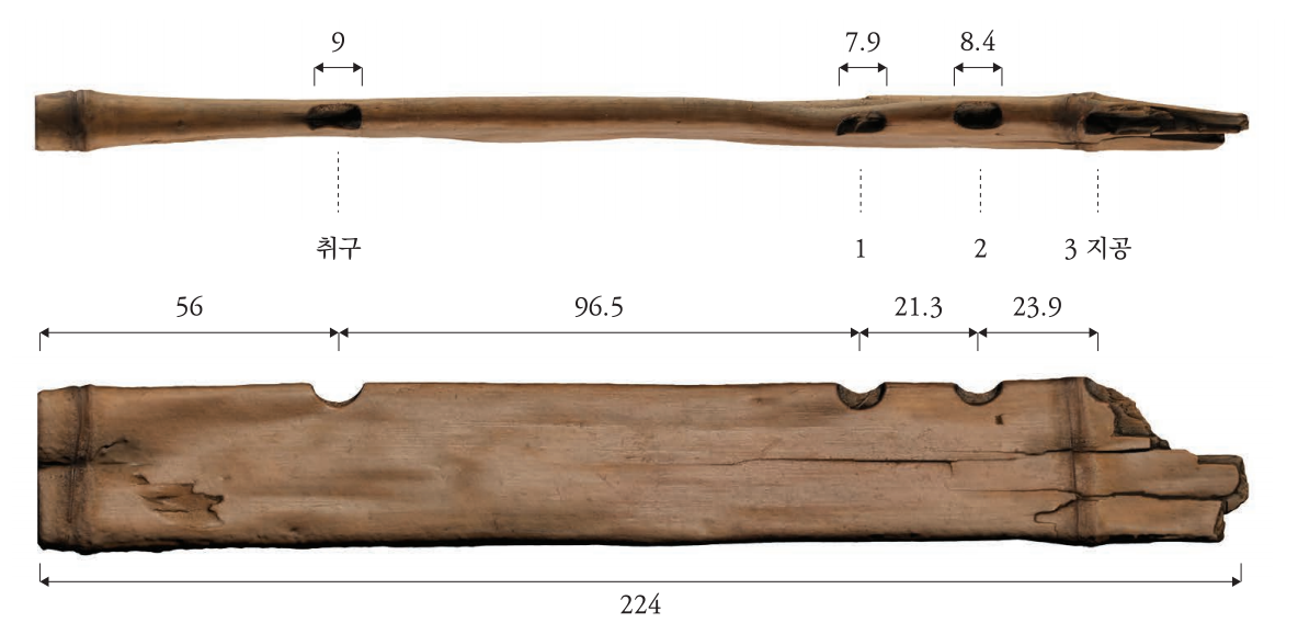 발견된 횡적의 총 길이는 22.4㎝였다. 한쪽에는 인위적으로 절단한 흔적이 남았다. 구멍은 4개가 남아있었는데 3개는 인위적으로 뚫린 지공(指孔·손가락 구멍), 다른 하나는 입김을 불어 넣는 취공(吹孔)이었다. 엑스레이 분석 결과 한쪽 끝이 막힌 구조로 판명됐는데, 이는 세로로 부는 관악기인 종적(縱笛)과 횡적을 구분하는 중요한 특징이다.