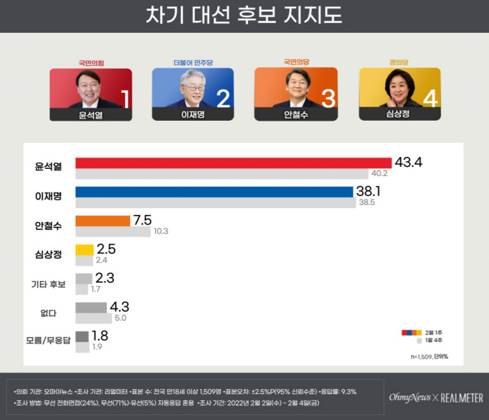 매주 실시하는 정례조사에서는 이 후보와 윤 후보 간 격차가 벌어졌다. 오마이뉴스·리얼미터가 지난 2~4일 18세 이상 1509명에게 조사한 결과 이 후보는 38.1%, 윤 후보는 43.4%의 지지율을 각각 얻었다. 안 후보는 7.5%, 심 후보는 2.5%였다. 이 후보와 윤 후보의 격차는 5.3%포인트로 오차범위(±2.5%포인트)를 넘어섰다. 같은 기관의 직전 조사인 지난달 23~28일 조사(18세 이상 3046명 대상·오차범위 ±1.8%포인트)에서 두 후보 격차는 1.7%포인트였다. 윤 후보 지지율이 3.2%포인트 상승하는 동안 이 후보는 0.4%포인트 하락하며 격차가 벌어졌다.