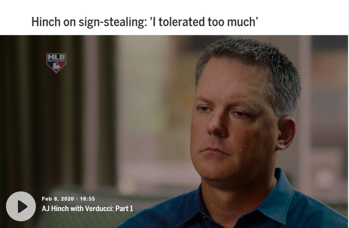 메이저리그 사무국의 사인 훔치기 조사는 지난해 말 ‘디 애슬래틱’을 통한 투수 마이크 파이어스의 폭로가 있은 후 약 3개월동안 계속됐다. 힌치는 “조사 기간 동안 내가 장기간 출전 정지 징계를 받으리라 생각했다”며 “내가 과거에 ‘옳은 것과 옳지 않은 것을 더 분명히 나눴어야 하는데’라는 생각이 들었다”고 말했다.