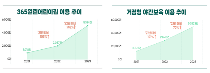 특히 2022년부터는 어린이집·유치원을 다니지 않는 가정 양육 아동까지 야간보육을 이용할 수 있게 되면서 이용률이 늘어난 것으로 보인다.
