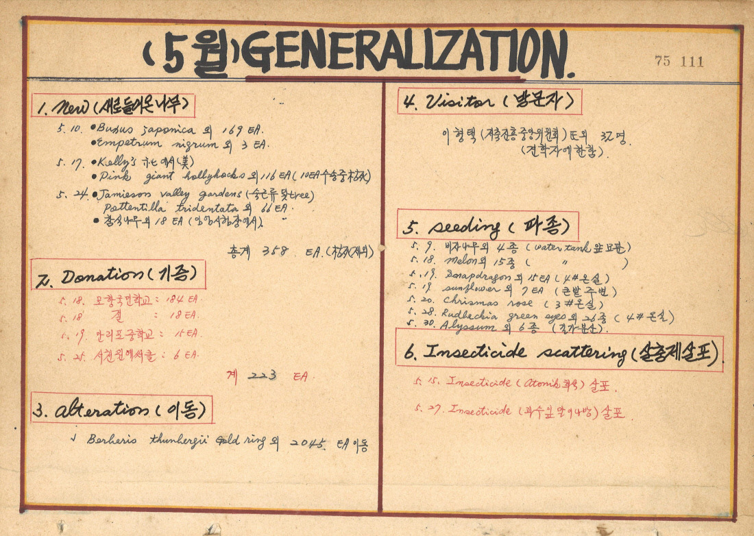 토지매입증서는 1962년 수목원 조성을 위해 사들인 필지 9000㎡ 관련 내용으로 매매 금액이 적혀 있다. 업무일지에는 날짜별로 수목원에 도입한 식물 목록, 식재 위치도, 첫눈 등 기상 상태가 적혀 있다. 식물채집일지에는 채집한 식물의 학명, 장소, 목적 등이, 식물번식일지에는 파종 현황 및 식물 상태, 토양 개량법 실험 내용 등이 각각 적혔다.