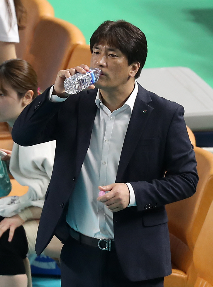 19일 경북 김천실내체육관에서 열린 프로배구 여자부 플레이오프 3차전 한국도로공사와 GS칼텍스의 경기. GS칼텍스 차상현 감독이 물을 마시고 있다. 김천 | 연합뉴스
