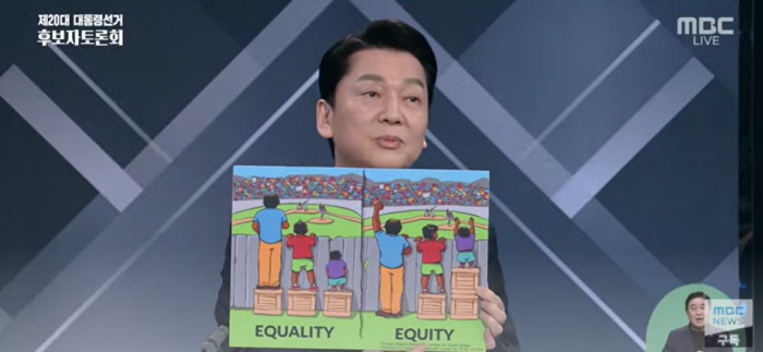 안 후보는 이날 서울 여의도 KBS에서 열린 중앙선거방송토론위원회 주관 TV토론에서 ‘Equality’(평등)와 ‘Equity’(공평)을 비교하는 손팻말을 들었다. 이 손팻말에는 키가 다른 세 인물이 야구장 담장 앞에 서 있다. ‘평등’ 그림에는 모두가 같은 높이의 상자를 발밑에 둬 키가 가장 작은 사람이 담장 너머 야구경기를 보지 못하고 있다. ‘공평’ 그림에는 키 큰 사람은 상자 없이 야구경기를 보고, 키가 가장 작은 사람은 상자 두개를 발 밑에 깔면서 담장 너머 야구 경기를 볼 수 있도록 했다.