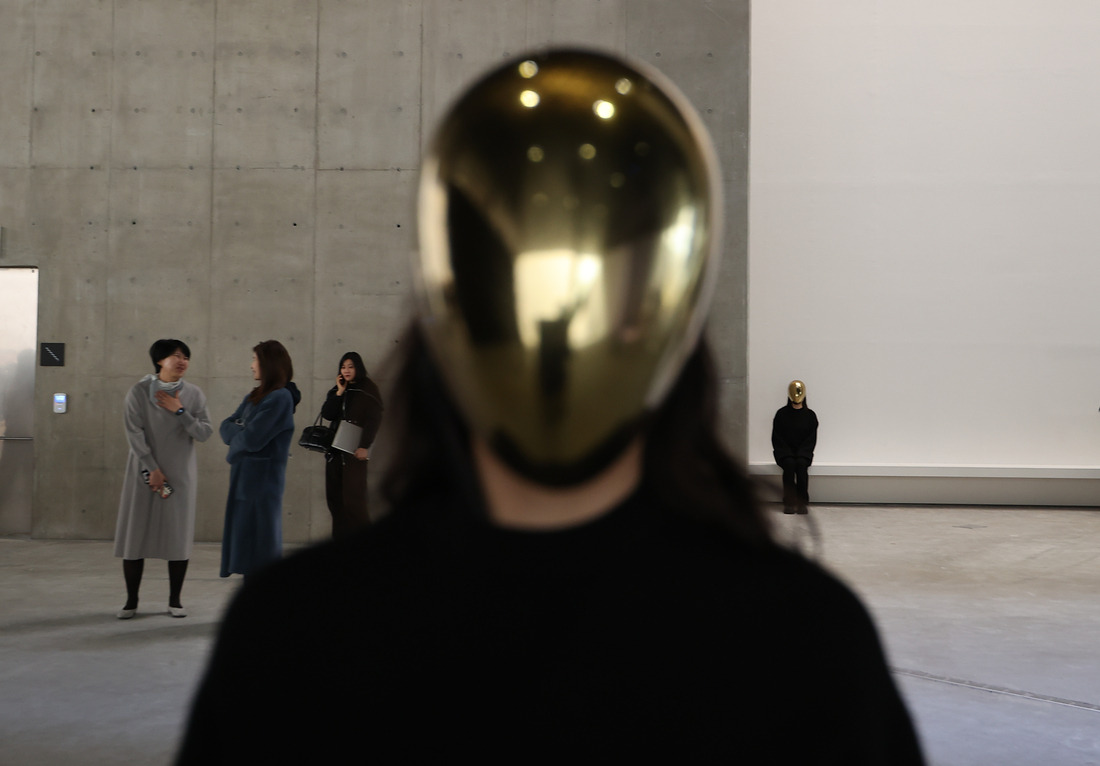 에스컬레이터를 타고 아래층으로 내려가면 가장 큰 화면에 ‘카마타’가 있다. 칠레 아타카마 사막 어딘가에 놓인 사람의 유골과 그 옆을 지키는 작은 기계의 모습이 상연된다. 카메라와 집게손 등으로 구성된 기계는 유골에 일종의 장례의식을 한다고 작가는 설명한다. 전시장에는 얼굴을 덮은 금색 마스크를 쓴 이들도 돌아다닌다. 이 작품은 ‘이디엄’으로, 마스크에서는 알 수 없는 소리가 들린다. 삼성서울병원으로부터 전달받은 암세포가 배양된 ‘암세포 배양기’는 바로 옆 작품 ‘U움벨트-안리’와 연결됐다. 암세포의 분열 양상에 따라 ‘U움벨트-안리’에는 새로운 이미지가 반영된다.